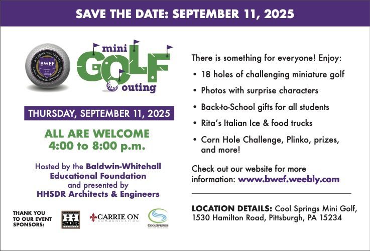 Cool Springs 3001 Cool Springs Dr., Pittsburgh, PA, United StatesThe Baldwin-Whitehall Educational Foundation (BWEF) is hosting a mini golf outing at Cool Springs Mini Golf on Thursday, September 11, 2025, from 5-8 p.m. The event will feature mini golf, skills challenges, prizes, frozen treats, s'mores & family fun. The event will support the Highlander Hub, a new student-managed apparel/convenience store at Baldwin High School.