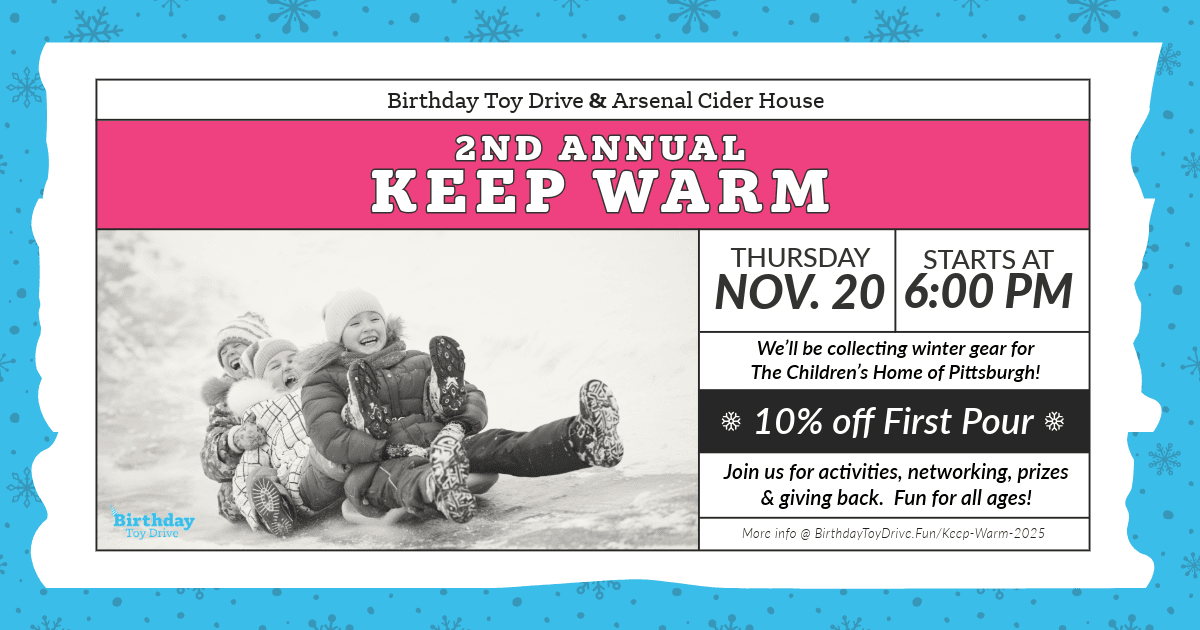 Arsenal Cider House Dormont 2905 W Liberty Ave., Pittsburgh, United StatesJoin us Nov 20th, 6–9 PM at Arsenal Cider House for our 2nd Annual Keep Warm Event with donations, raffles & more!
