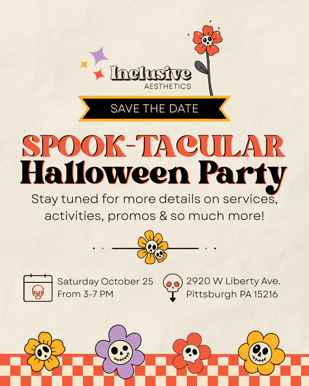 Inclusive Aesthetics 2920 W Liberty Ave., Pittsburgh, PA, United StatesJoin our friends at Inclusive Aesthetics for their annual SPOOK-TACULAR Halloween Party! Stay tuned for more details on services, activities, promos & so much more!