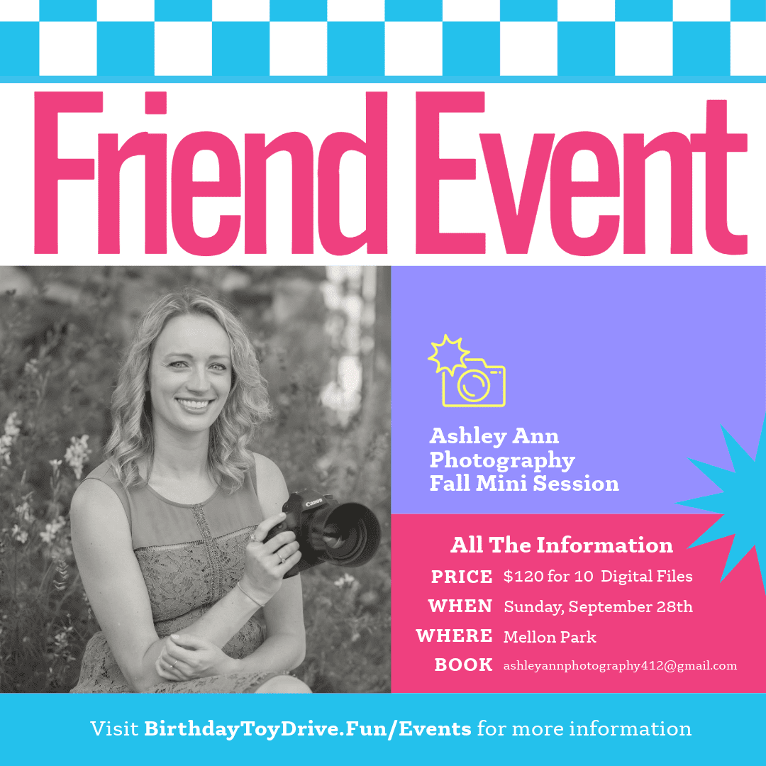 Mellon Park 1047 Shady Ave., Pittsburgh, PA, United StatesAshley Ann Photography is hosting Fall Mini Sessions on Sunday, September 28! 10 - Digital Files All-access printing rights Time : 20 minute session Price : $120 When : Sunday, September 28th Location: Mellon Park Email Ashley Ann Photography for remaining time slot & more information