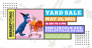 Join us May 25 in Finleyville for a yard sale! 100% of proceeds go to buying toys for the 8th Annual Birthday Toy Drive.