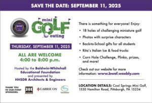 The Baldwin-Whitehall Educational Foundation (BWEF) is hosting a mini golf outing at Cool Springs Mini Golf on Thursday, September 11, 2025, from 5-8 p.m. The event will feature mini golf, skills challenges, prizes, frozen treats, s’mores & family fun. The event will support the Highlander Hub, a new student-managed apparel/convenience store at Baldwin High School.
